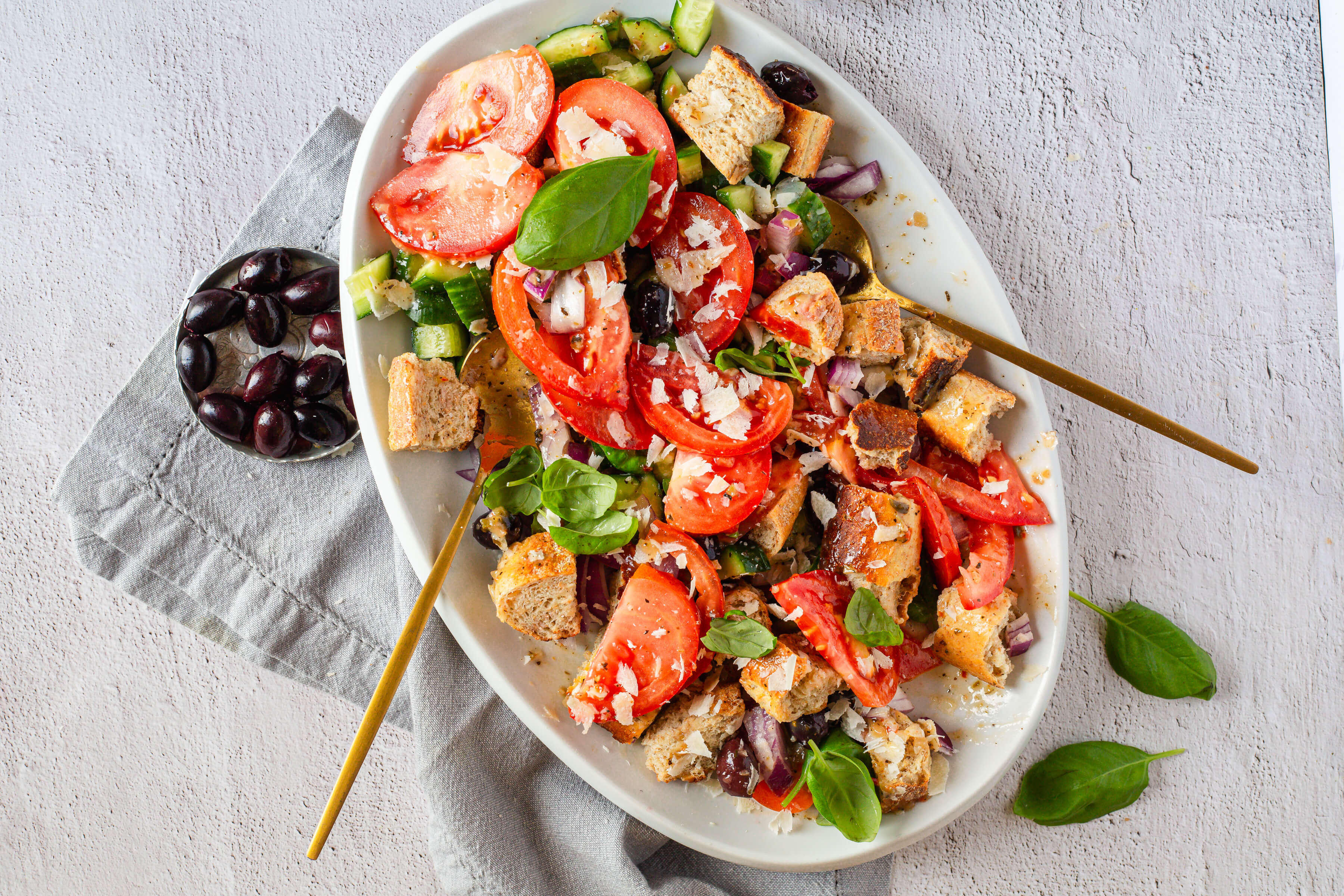 A colorful salad combining chunks of day-old bread, fresh tomatoes, cucumbers, onions, Kalamata olives and freshly-grated Parmesan cheese, tossed with Organicville® Italian Vinaigrette & Marinade. The bread soaks up the flavors of the vegetables and the creamy dressing in this simple yet satisfying Italian-inspired dish.